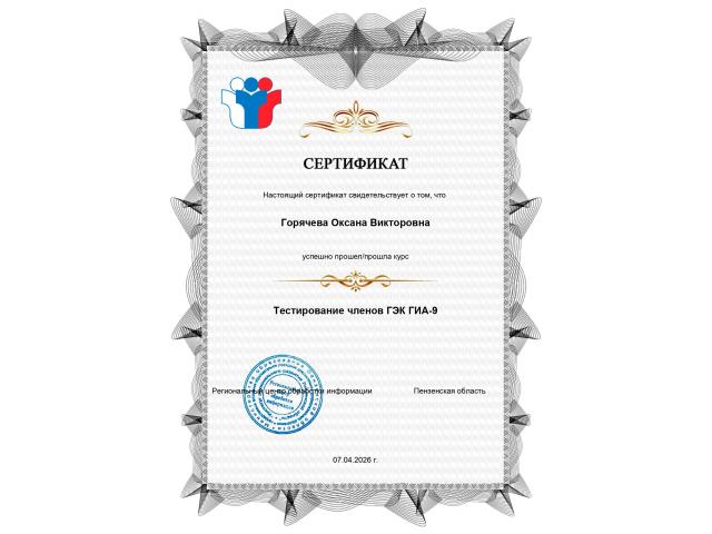 Горячева Оксана Викторовна, заместитель начальника Отдела образования администрации Пензенского района, прошла обучение по курсу "Тестирование членов ГЭК ГИА -9" на базе Регионального центра обработки информации Пензенской области.